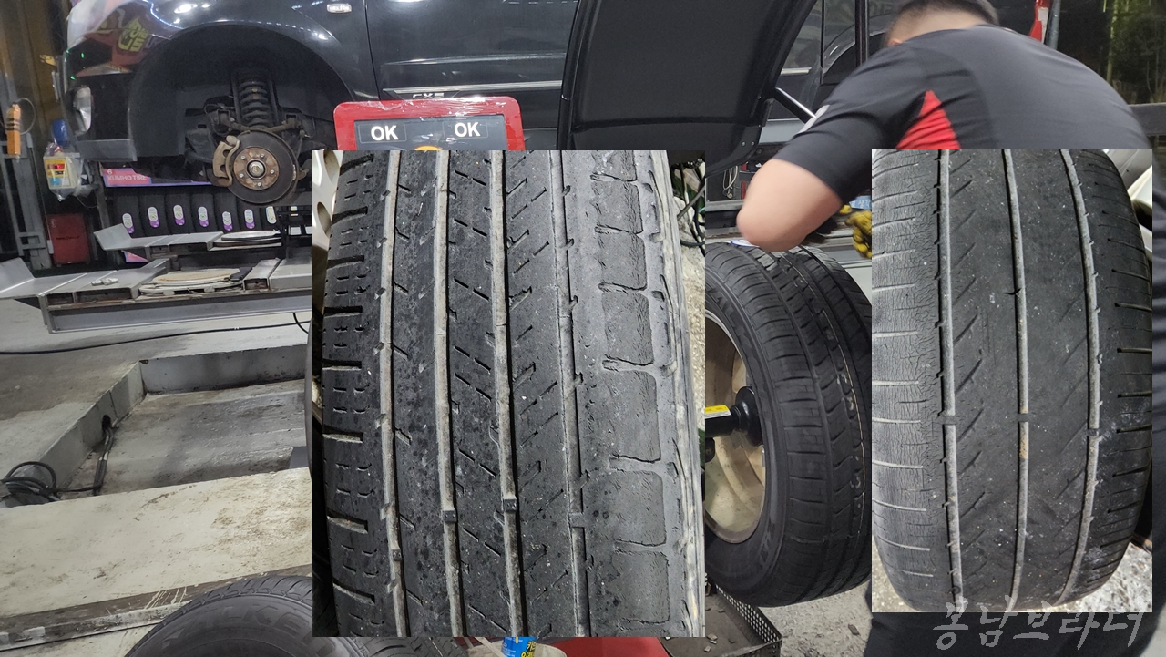왼쪽은 앞 타이어로 한쪽 마모가 심합니다. 오른쪽은 너무 오래된 타이어로 바닥도 맨들맨들, 그리고 갈라진 타이어가 위태롭네요. 가운데 새 타이어와 비교해보시면 타이어가 아주 심했네요. 죄송합니다. ^^
